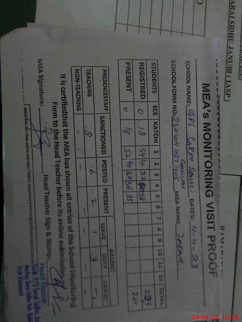 | Attendance Register | Head Teacher | MEA with School | Visit Proof |