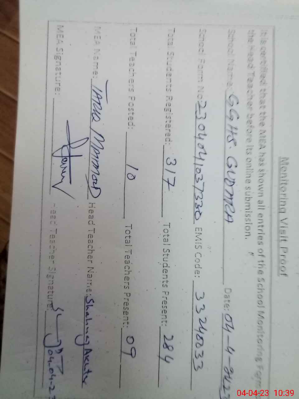 | EMIS Code: 33240033 | Name of School: GGHS GUDARA | |||
