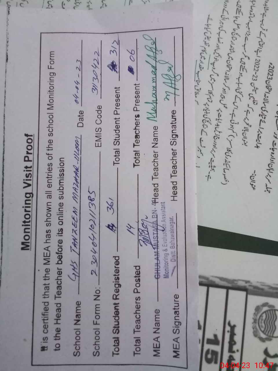 | EMIS Code: 31130422 | Name of School: GHS TANZEEM MAZHAR ULOOM FORT ABBAS | |||