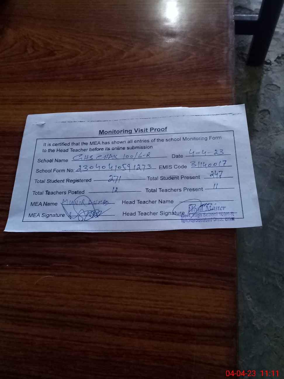| EMIS Code: 31140017 | Name of School: GHS CHAK NO. 100/6-R | |||