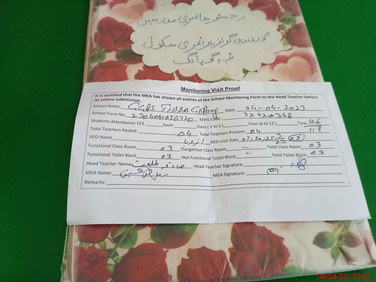 | Attendance Register | Head Teacher | MEA with School | Visit Proof |