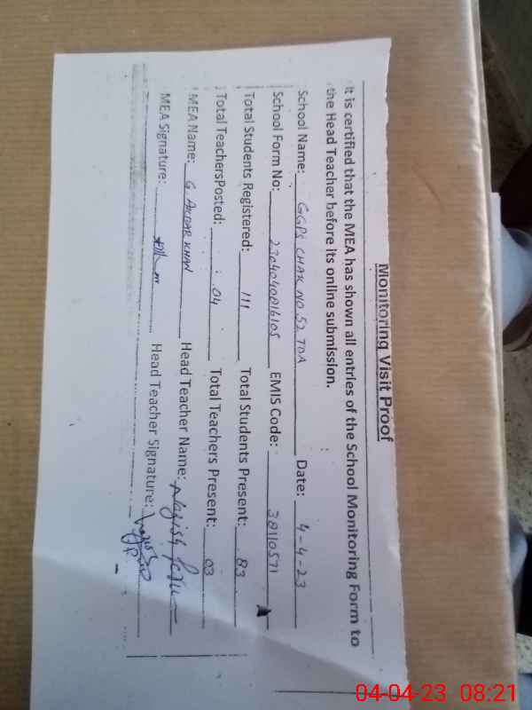 | EMIS Code: 38110571 | Name of School: GGPS CHAK NO.52/TDA | |||