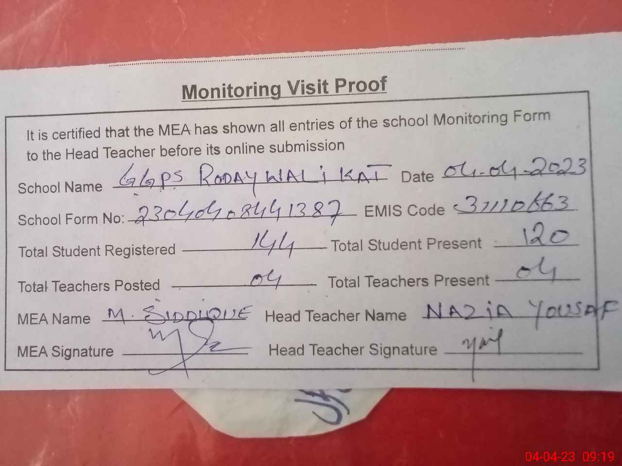 | Attendance Register | Head Teacher | MEA with School | Visit Proof |