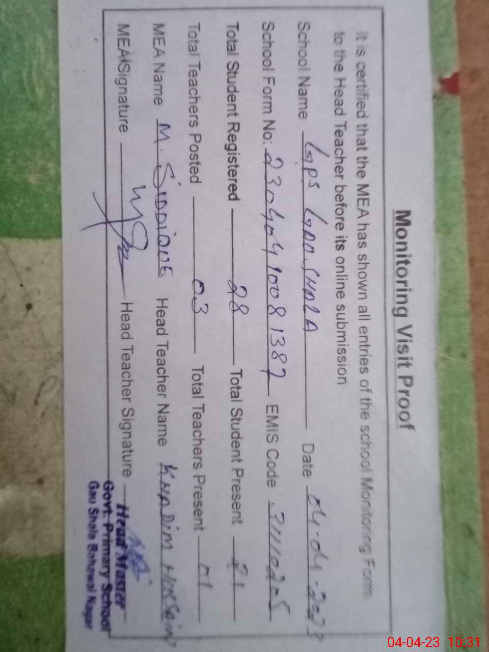 | Attendance Register | Head Teacher | MEA with School | Visit Proof |