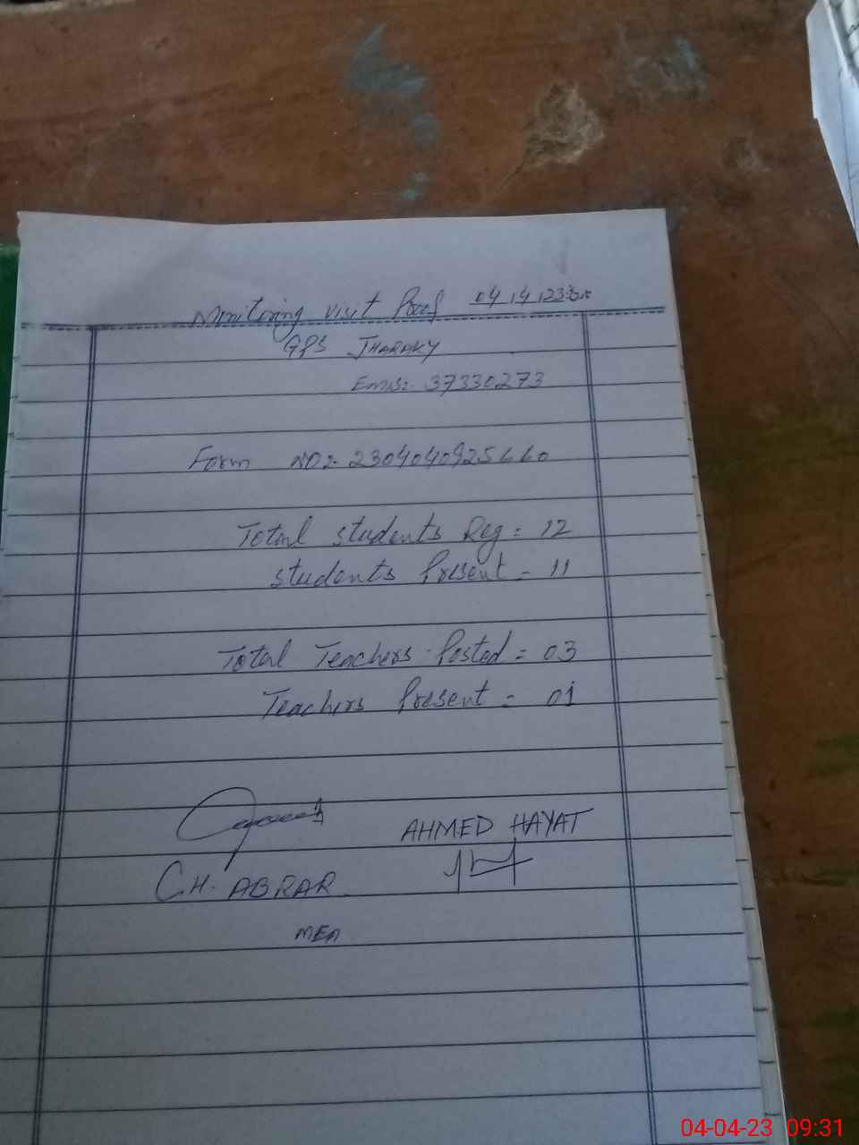 | Attendance Register | Head Teacher | MEA with School | Visit Proof |