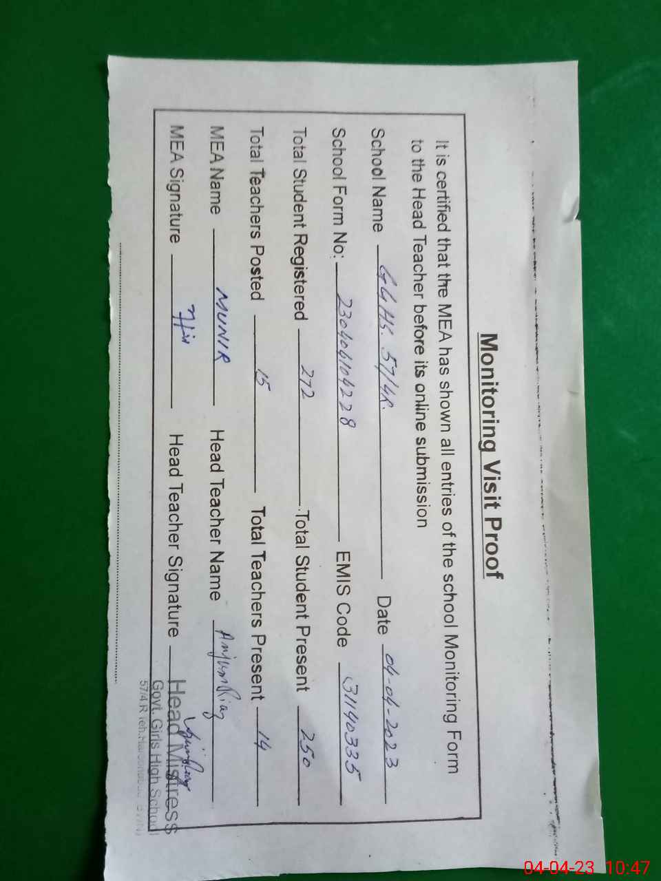 | Attendance Register | Head Teacher | MEA with School | Visit Proof |