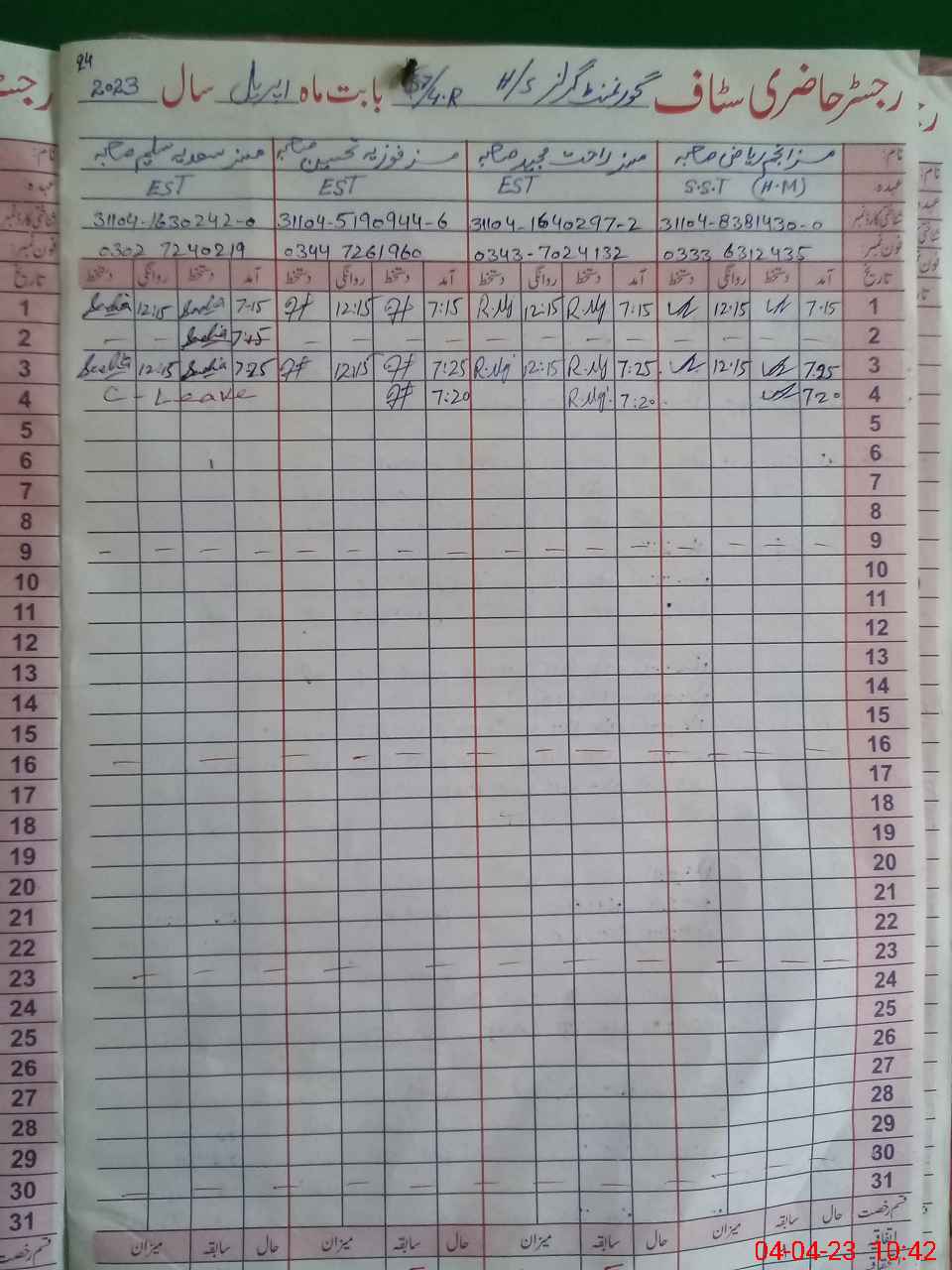 | CNIC | Full Name | Designation | R/C | Absence During Last Calender Month |