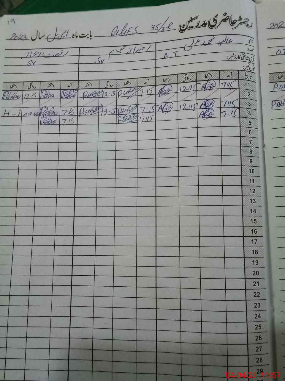 | CNIC | Full Name | Designation | R/C | Absence During Last Calender Month |