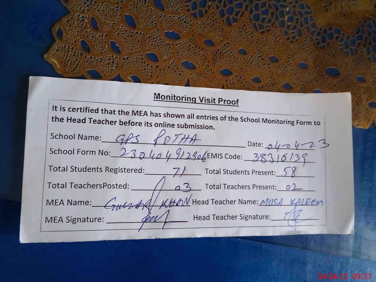 | Attendance Register | Head Teacher | MEA with School | Visit Proof |