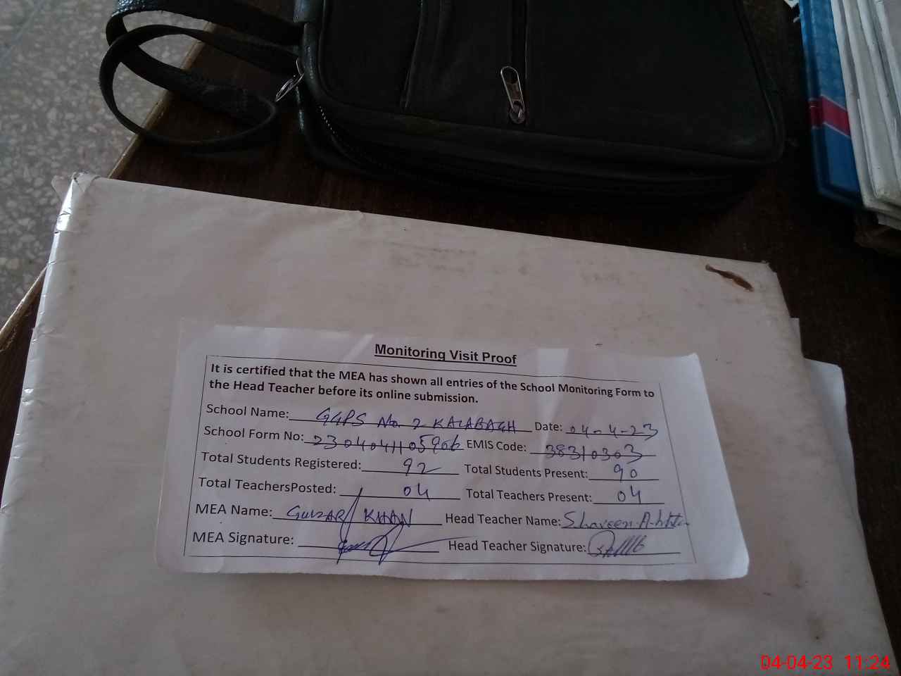 | Attendance Register | Head Teacher | MEA with School | Visit Proof |