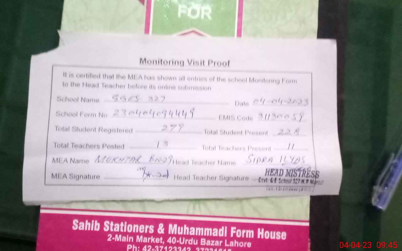 | Attendance Register | Head Teacher | MEA with School | Visit Proof |