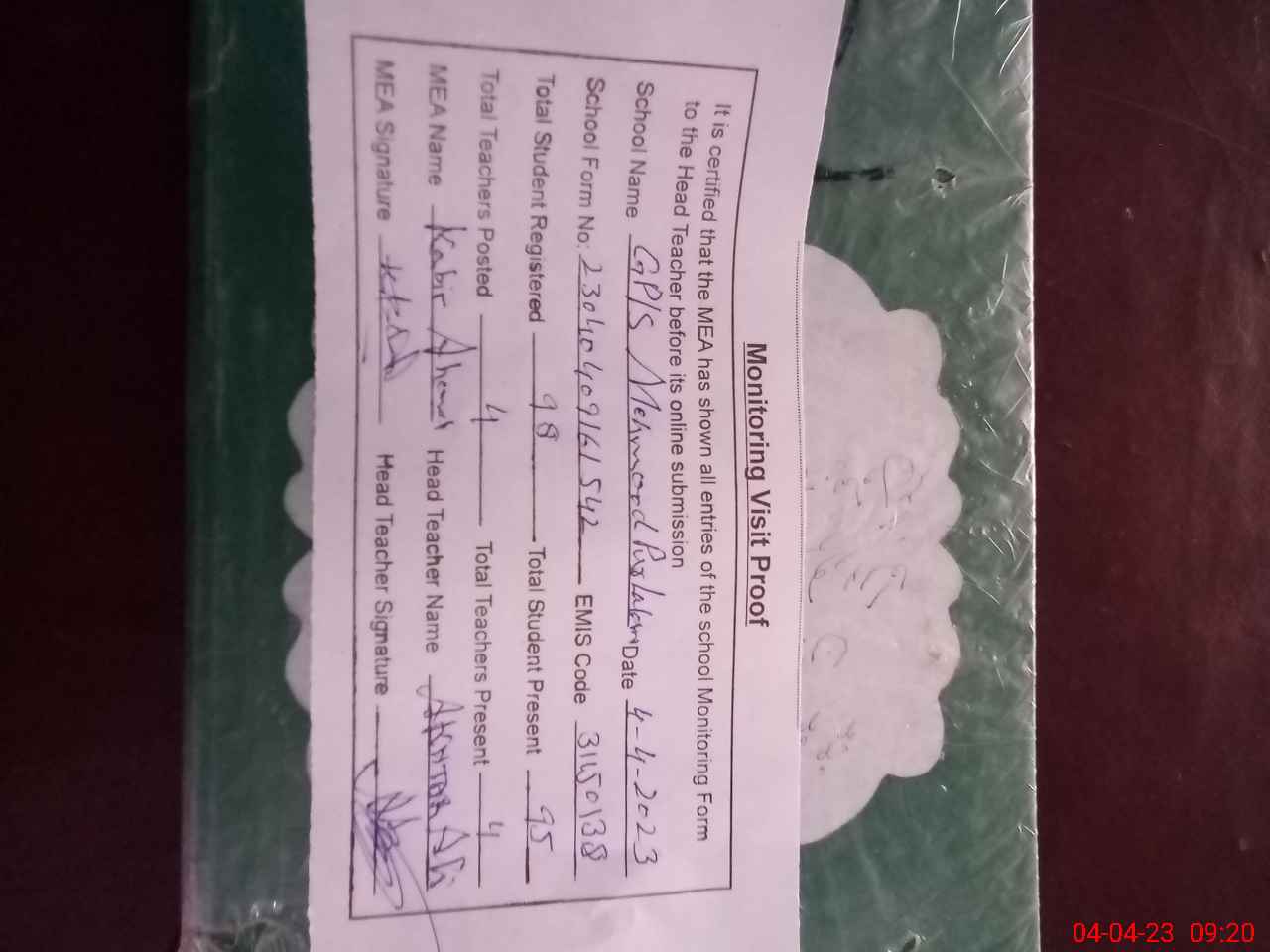 | Attendance Register | Head Teacher | MEA with School | Visit Proof |