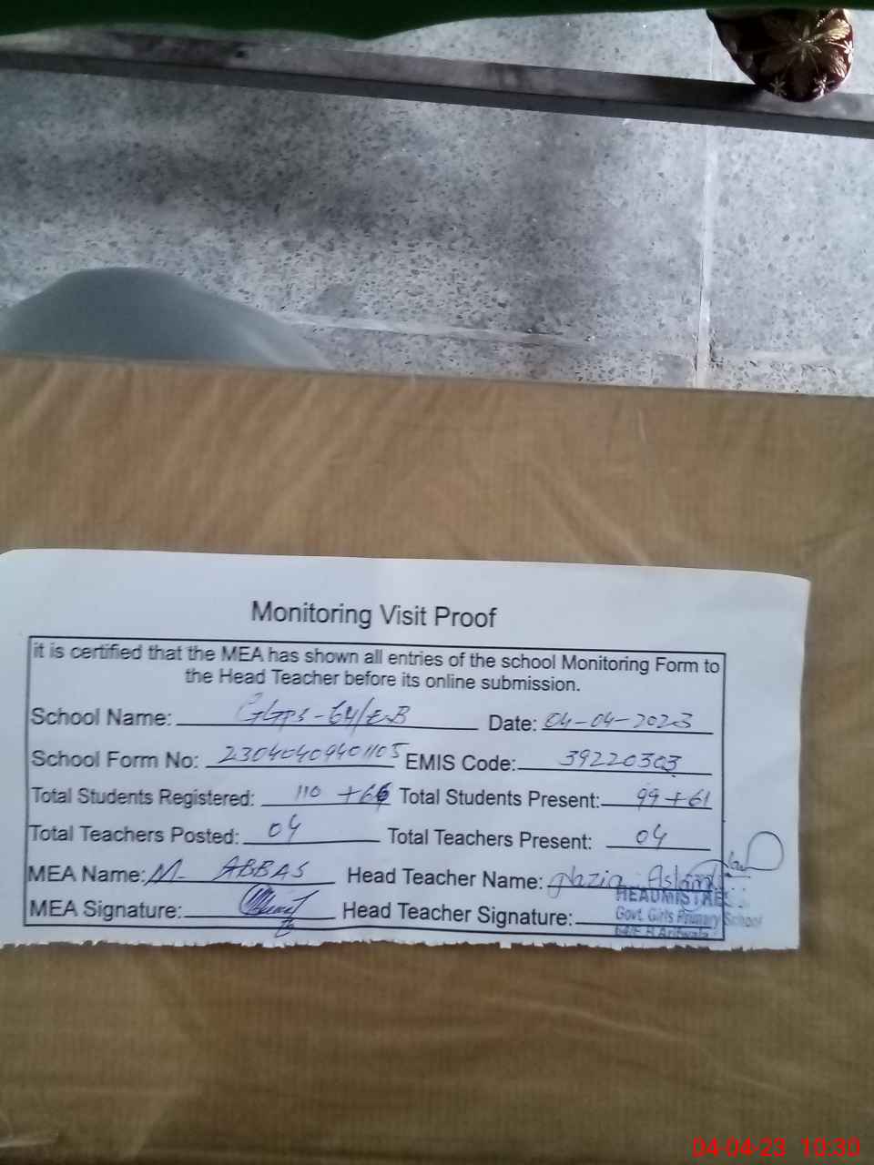 | EMIS Code: 39220303 | Name of School: GGPS 64/EB ARIFWALA | |||
