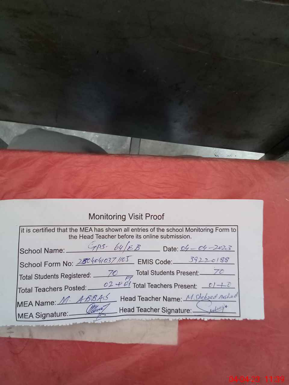 | Attendance Register | Head Teacher | MEA with School | Visit Proof |