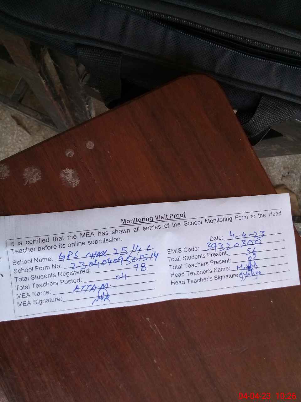 | Attendance Register | Head Teacher | MEA with School | Visit Proof |