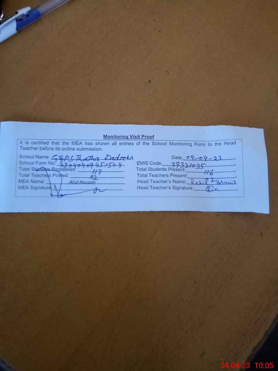 | Attendance Register | Head Teacher | MEA with School | Visit Proof |
