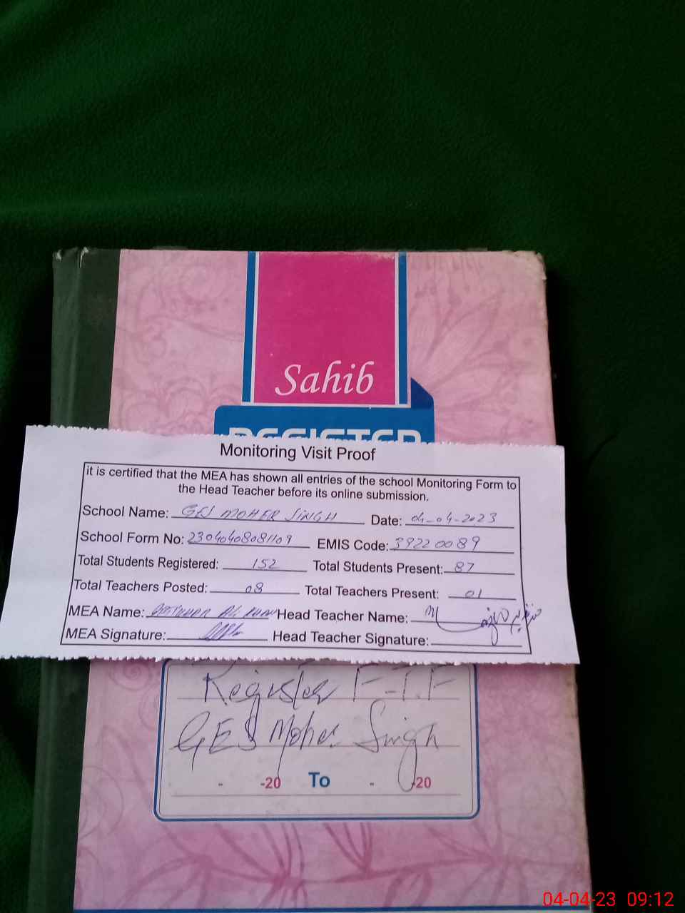 | Attendance Register | Head Teacher | MEA with School | Visit Proof |
