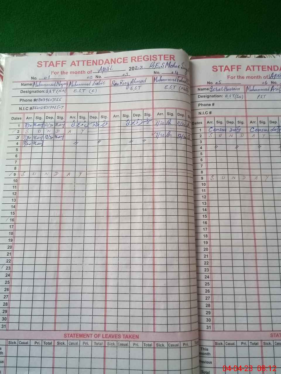 | CNIC | Full Name | Designation | R/C | Absence During Last Calender Month |