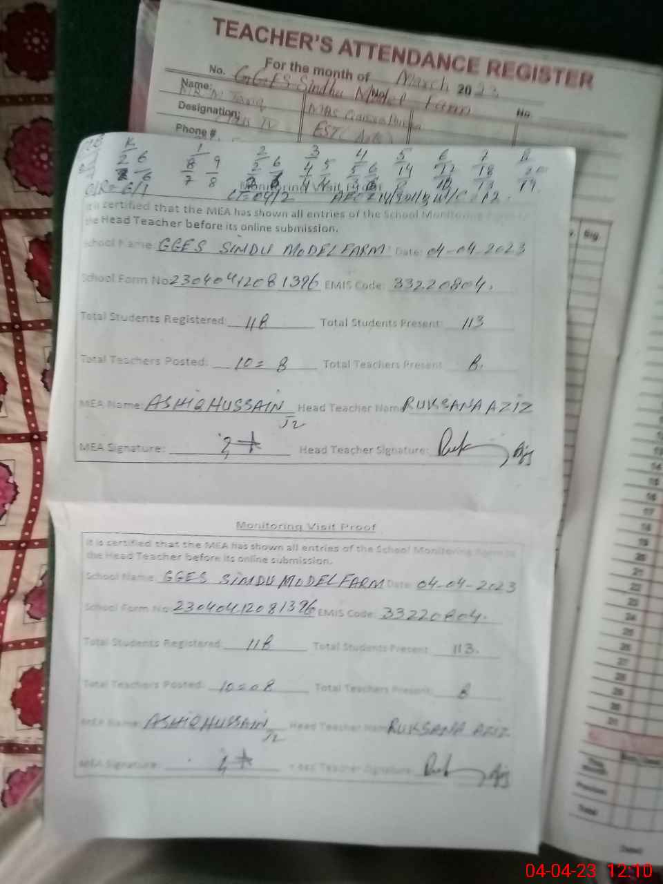 | Attendance Register | Head Teacher | MEA with School | Visit Proof |