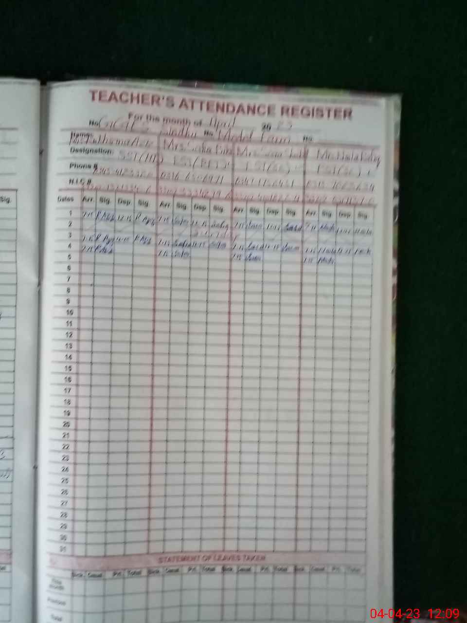 | CNIC | Full Name | Designation | R/C | Absence During Last Calender Month |
