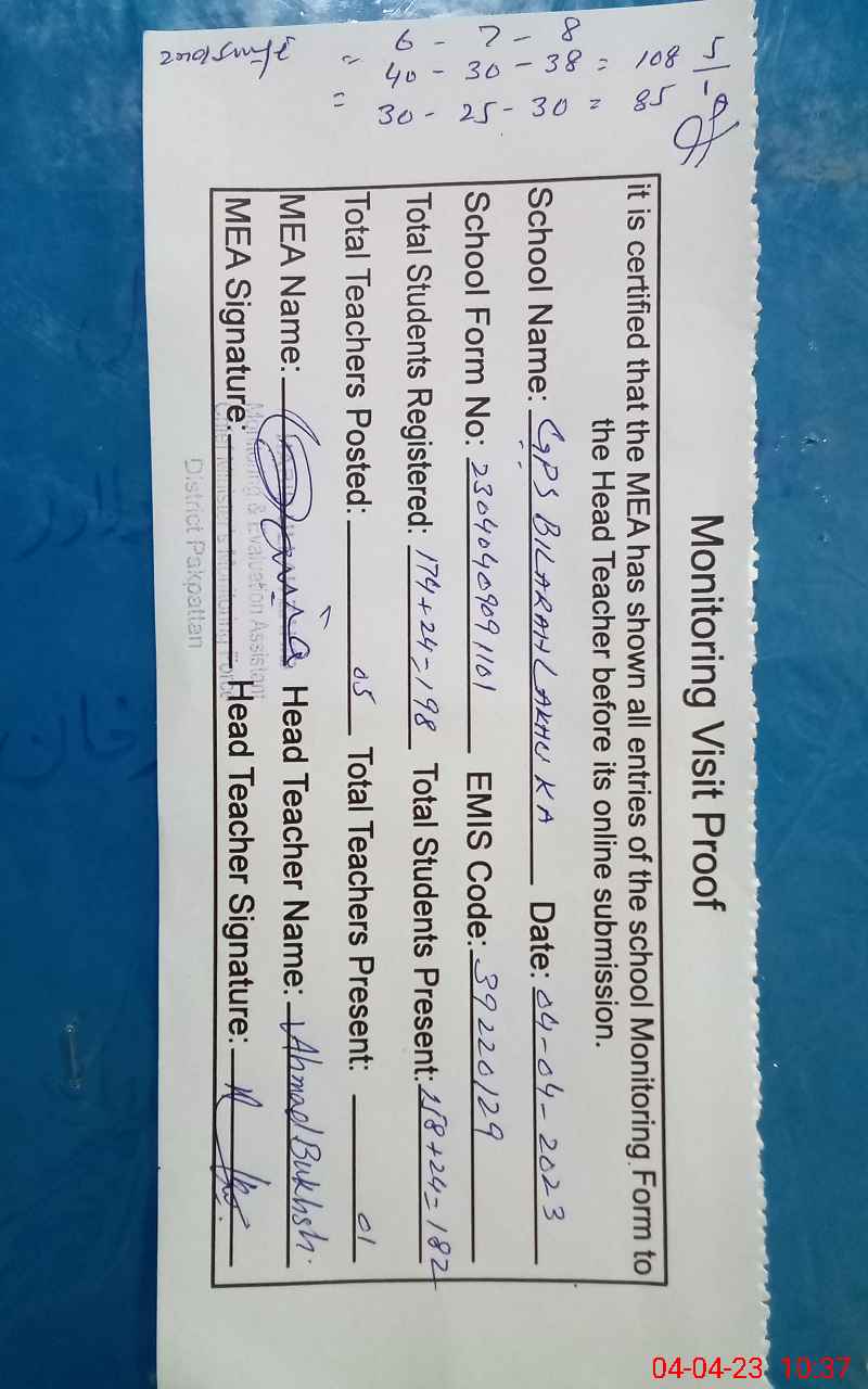 | Attendance Register | Head Teacher | MEA with School | Visit Proof |