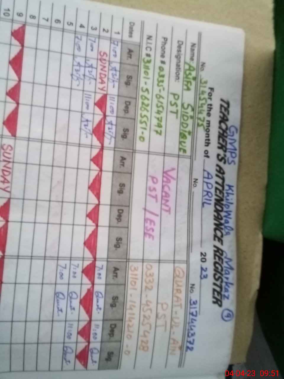 | Name: AS**** SI**** Designation: (School Headmaster's/Headmistress's) PST Phone/Cell Number: 03**** |