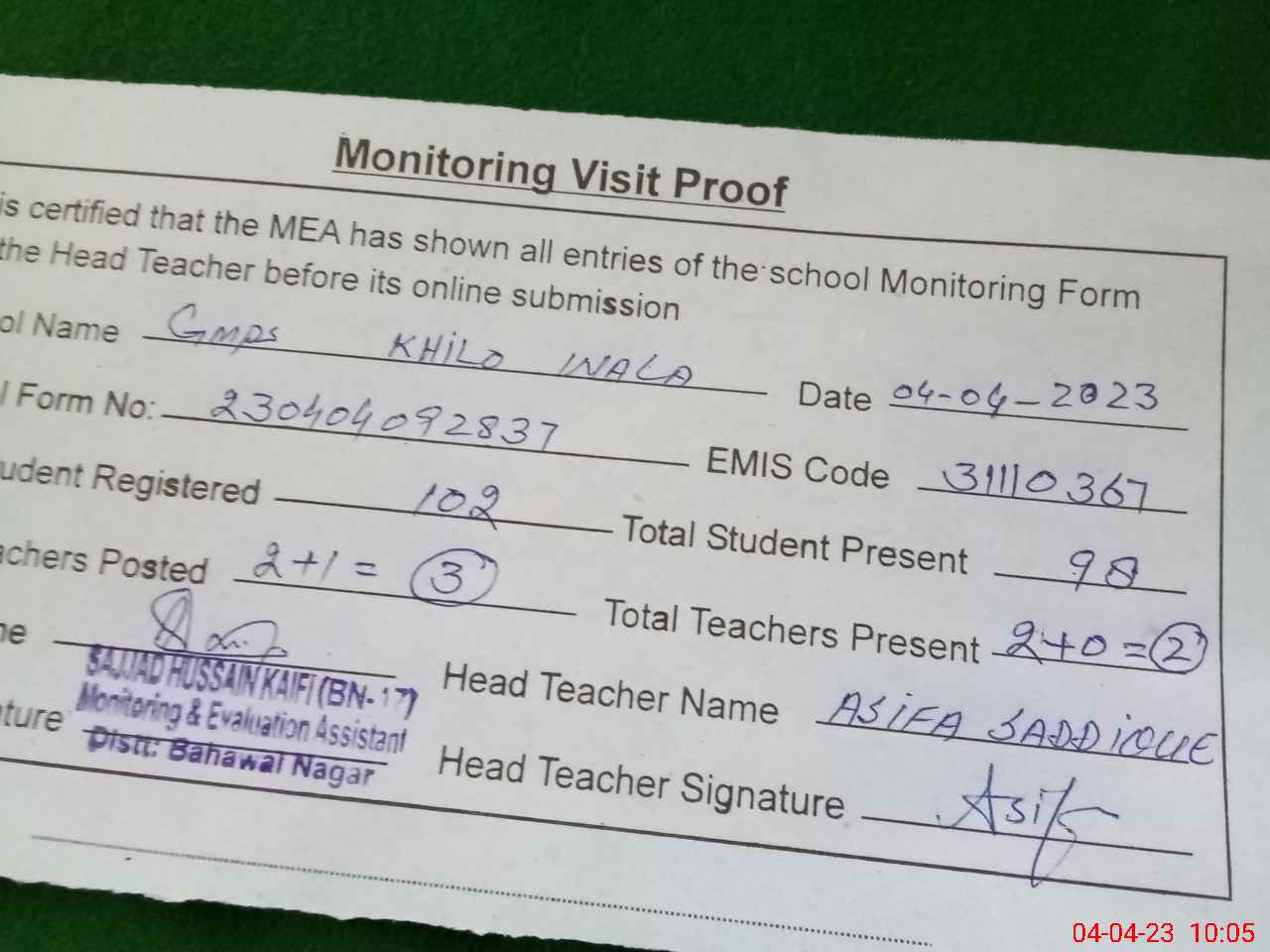| Monitoring Date: 04-04-2023 | Start Time: 04-04-2023 09:28 AM | End Time: 04-04-2023 10:23 AM | Name of MEA: Sa**** Hu**** Ka**** BN**** 17 | |