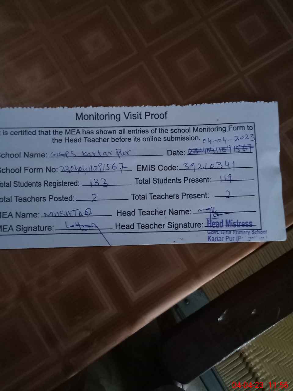 | Attendance Register | Head Teacher | MEA with School | Visit Proof |