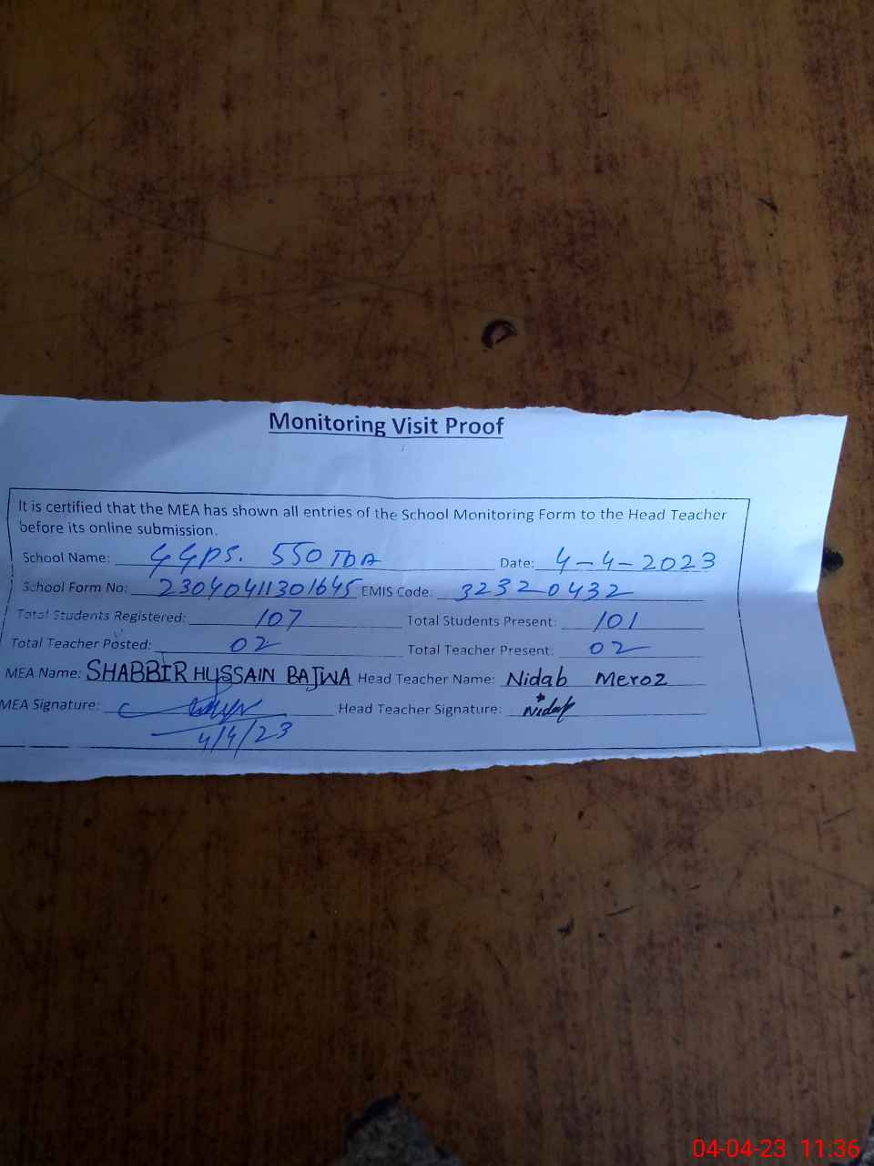 | Attendance Register | Head Teacher | MEA with School | Visit Proof |
