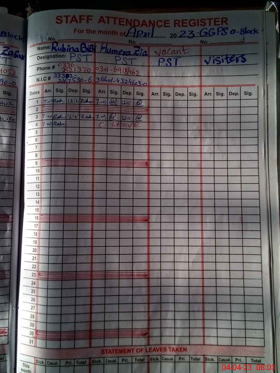 | Name: AZ**** PA**** Designation: (School Headmaster's/Headmistress's) PST Phone/Cell Number: 03**** |