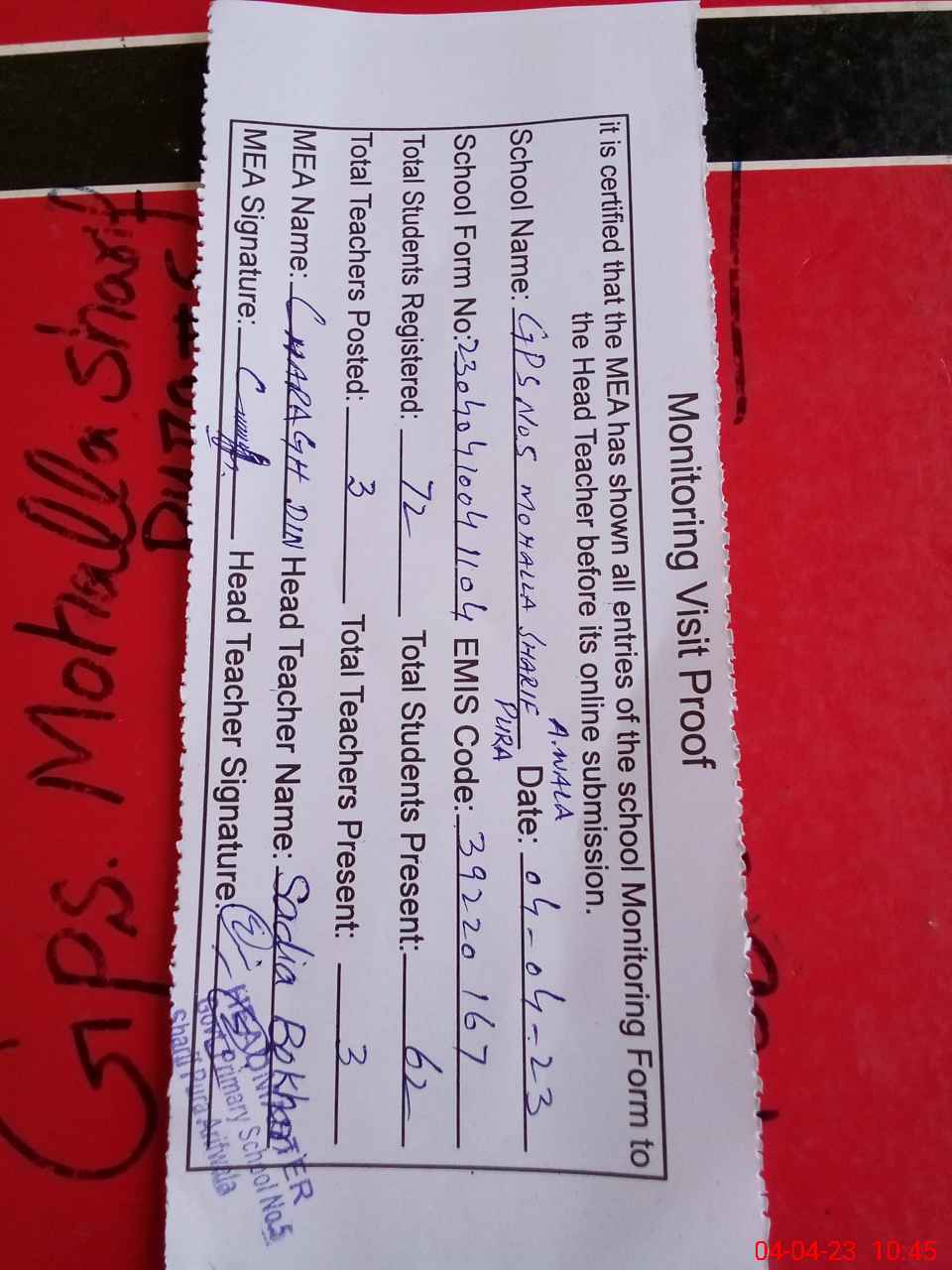 | EMIS Code: 39220167 | Name of School: GPS MOHALLA SHARIF PURA | |||
