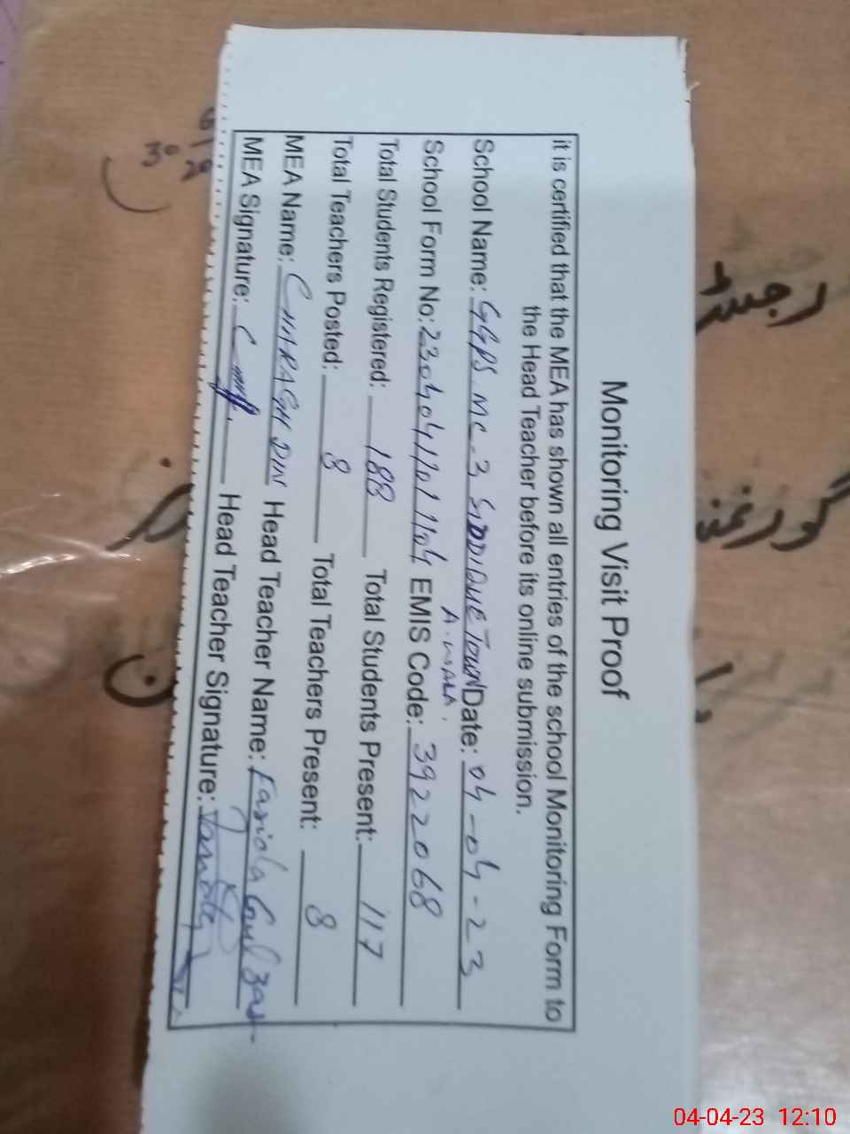 | Attendance Register | Head Teacher | MEA with School | Visit Proof |