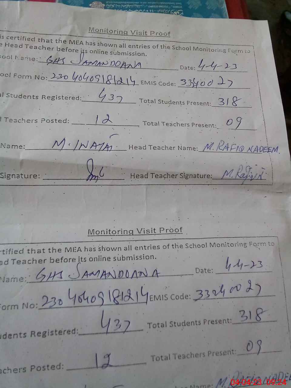 | Attendance Register | Head Teacher | MEA with School | Visit Proof |