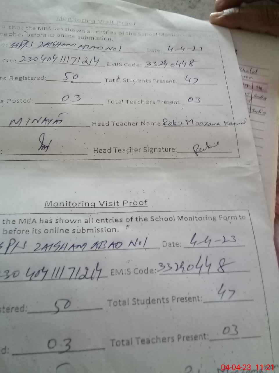 | Attendance Register | Head Teacher | MEA with School | Visit Proof |