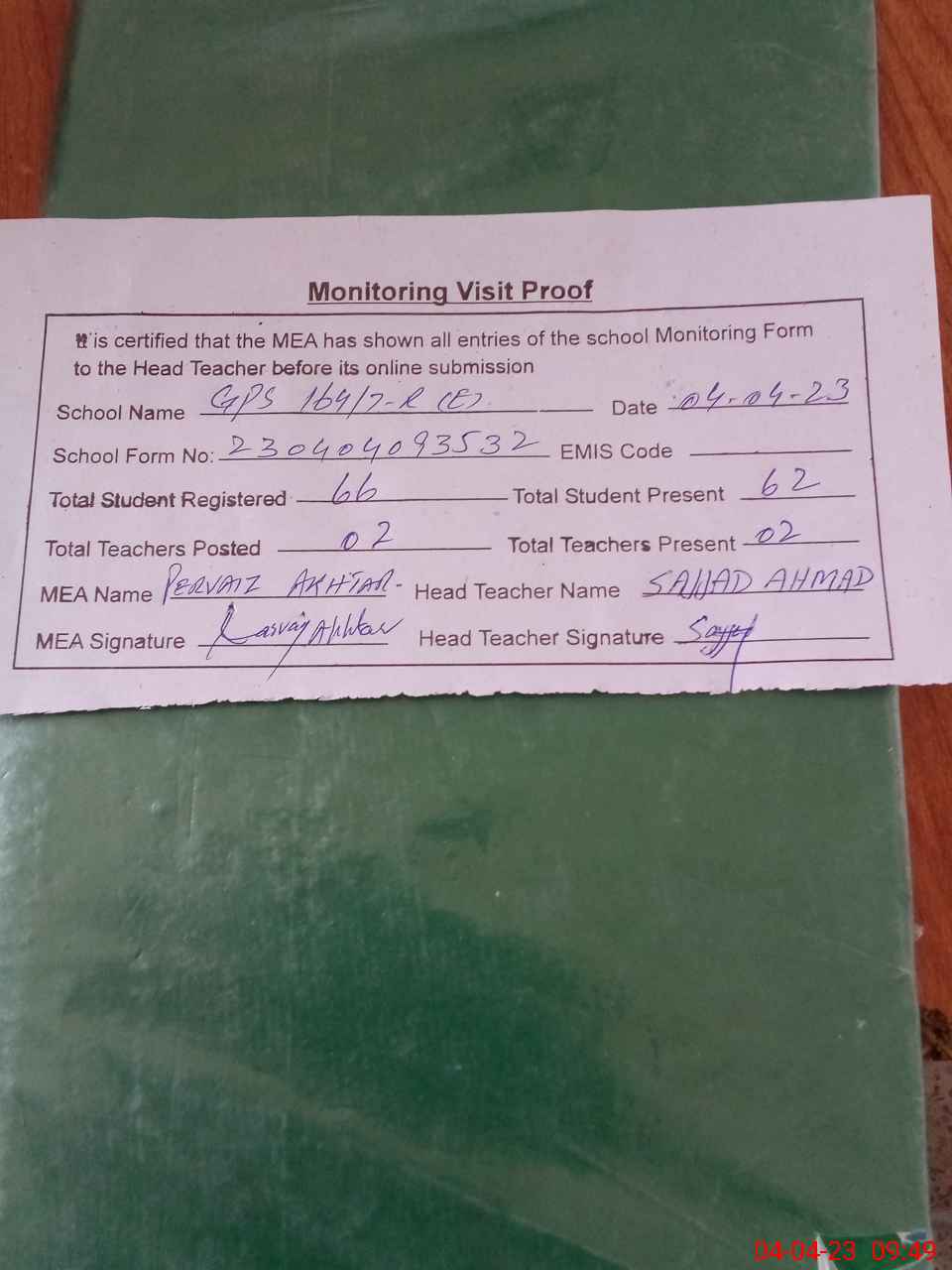 | Attendance Register | Head Teacher | MEA with School | Visit Proof |