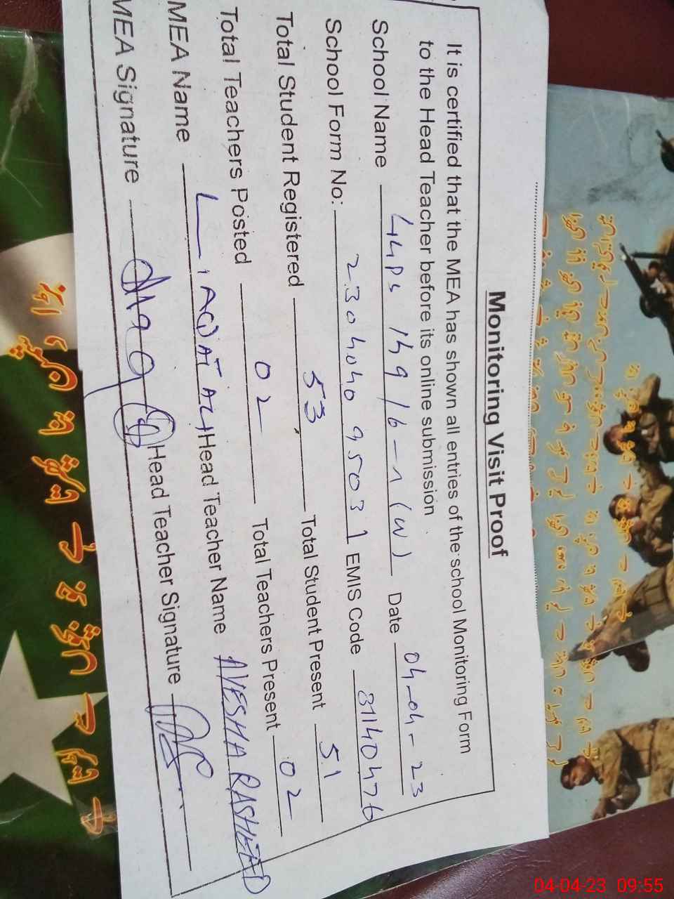 | Attendance Register | Head Teacher | MEA with School | Visit Proof |