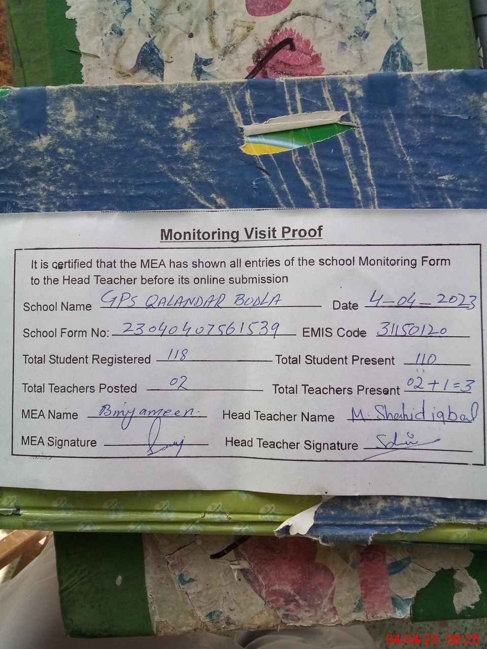 | EMIS Code: 31150120 | Name of School: GPS QALANDAR BODLA | |||
