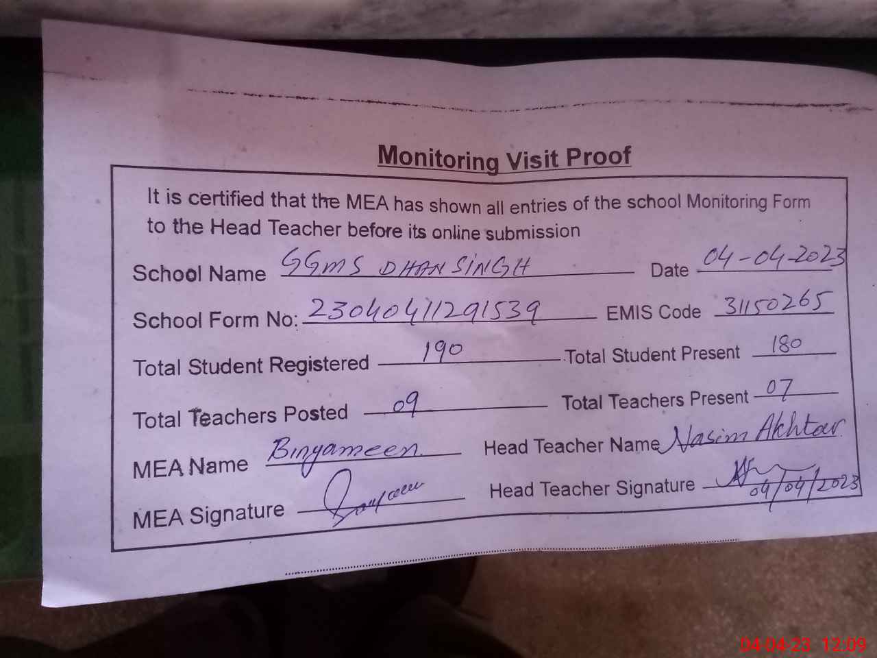 | Attendance Register | Head Teacher | MEA with School | Visit Proof |