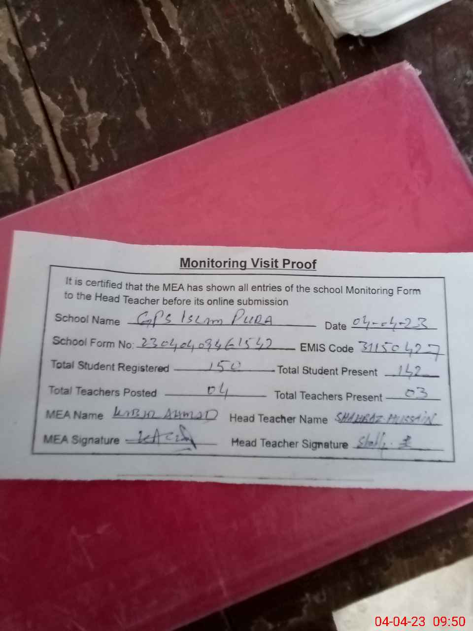 | EMIS Code: 31150427 | Name of School: GPS ISLAM PURA | |||