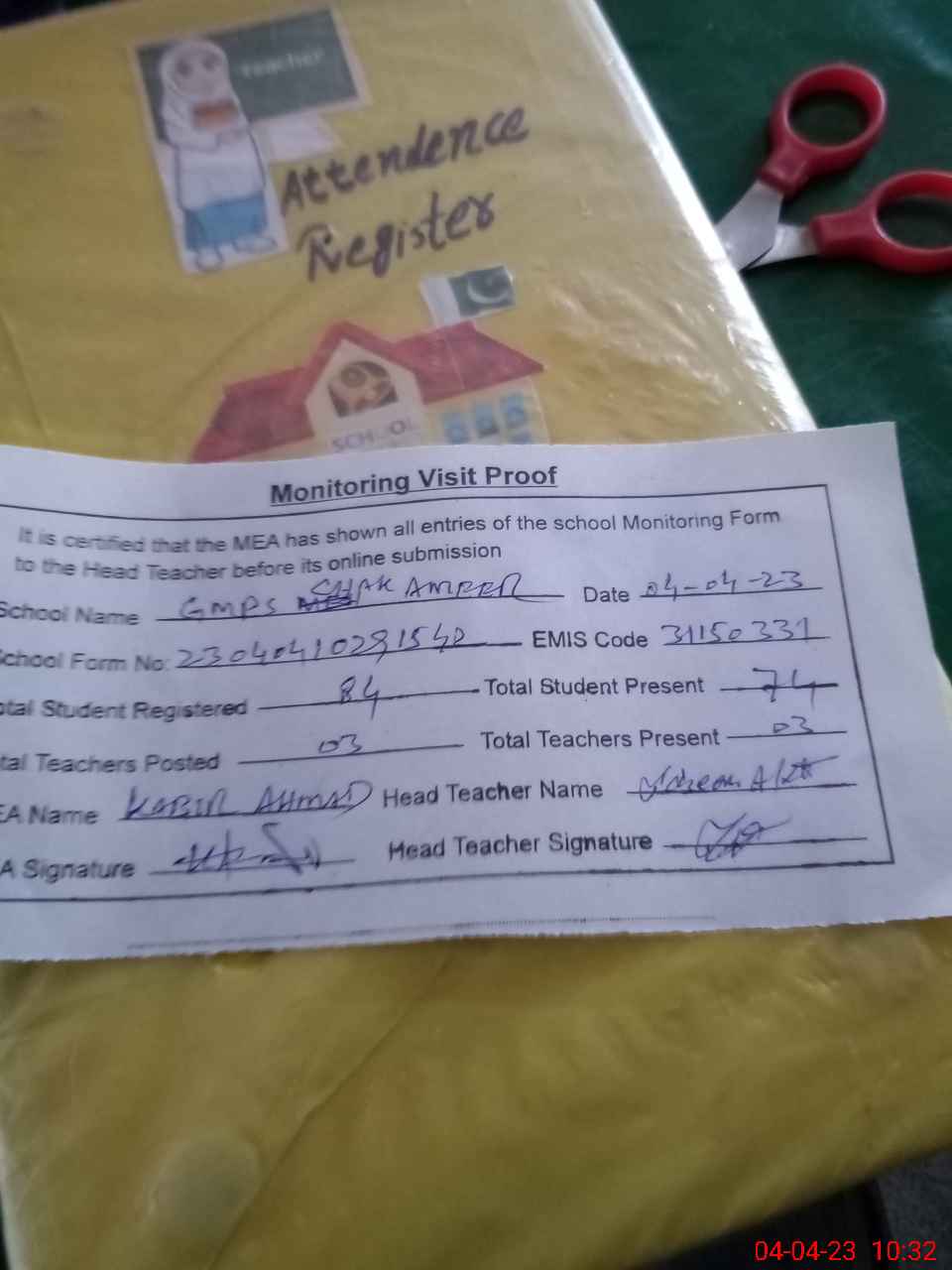 | Attendance Register | Head Teacher | MEA with School | Visit Proof |