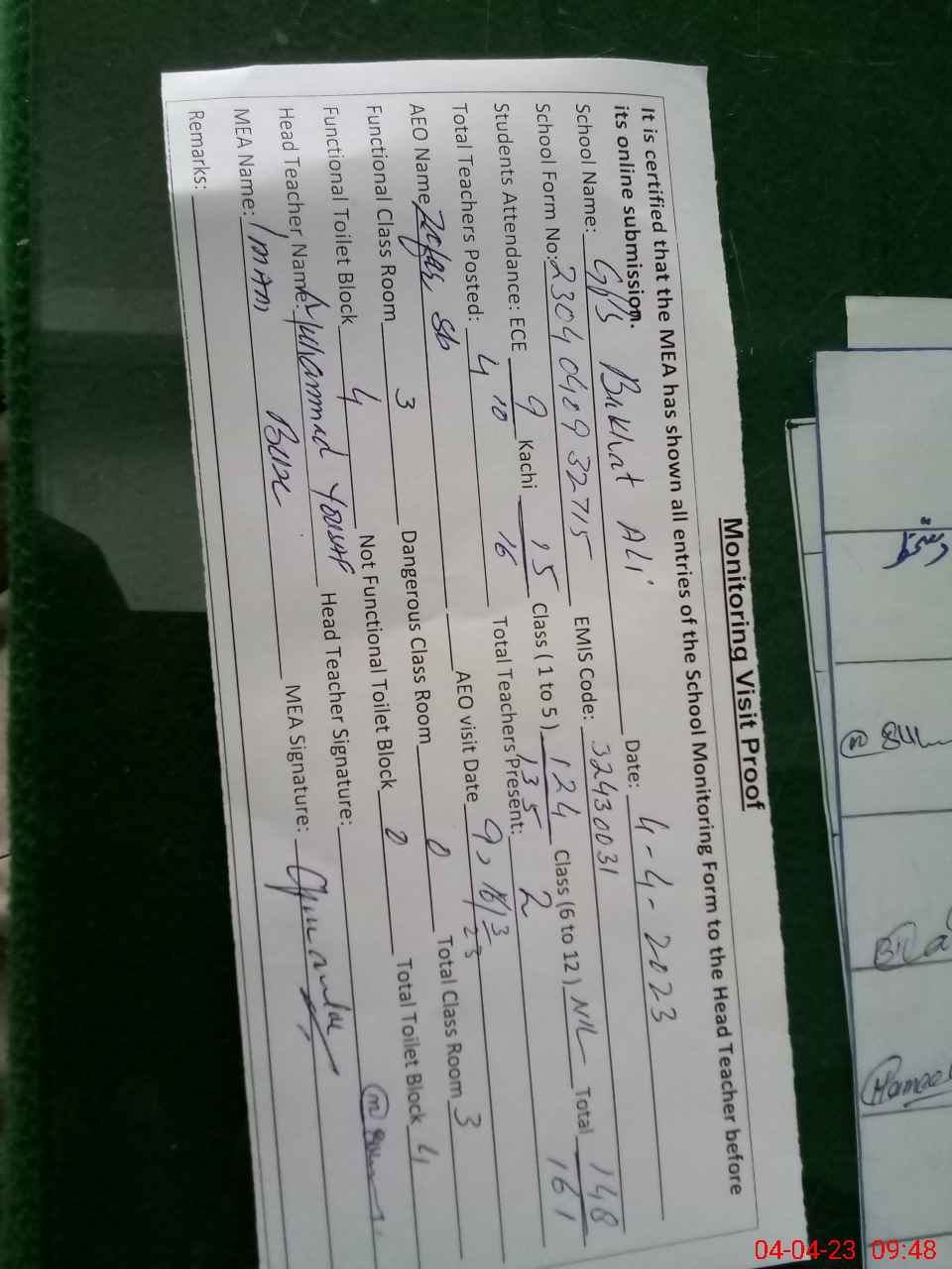 | Attendance Register | Head Teacher | MEA with School | Visit Proof |