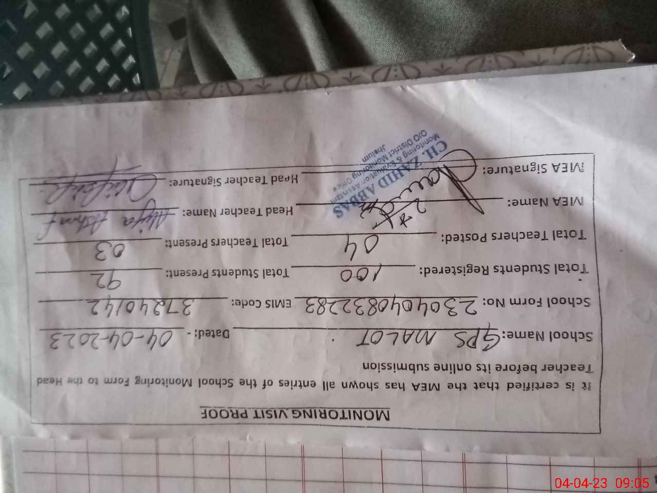 | Monitoring Date: 04-04-2023 | Start Time: 04-04-2023 08:32 AM | End Time: 04-04-2023 09:09 AM | Name of MEA: Za**** Ab**** | |