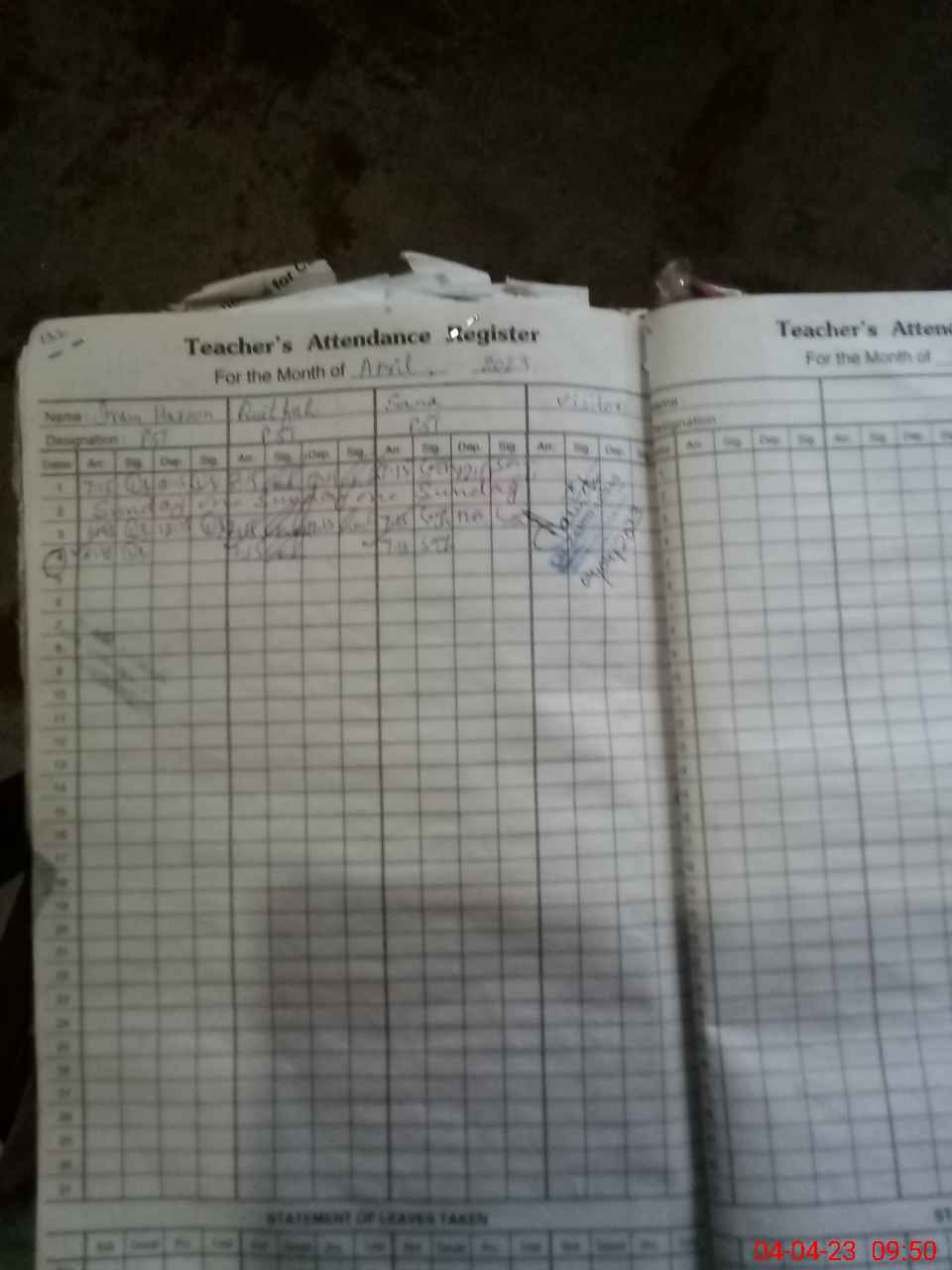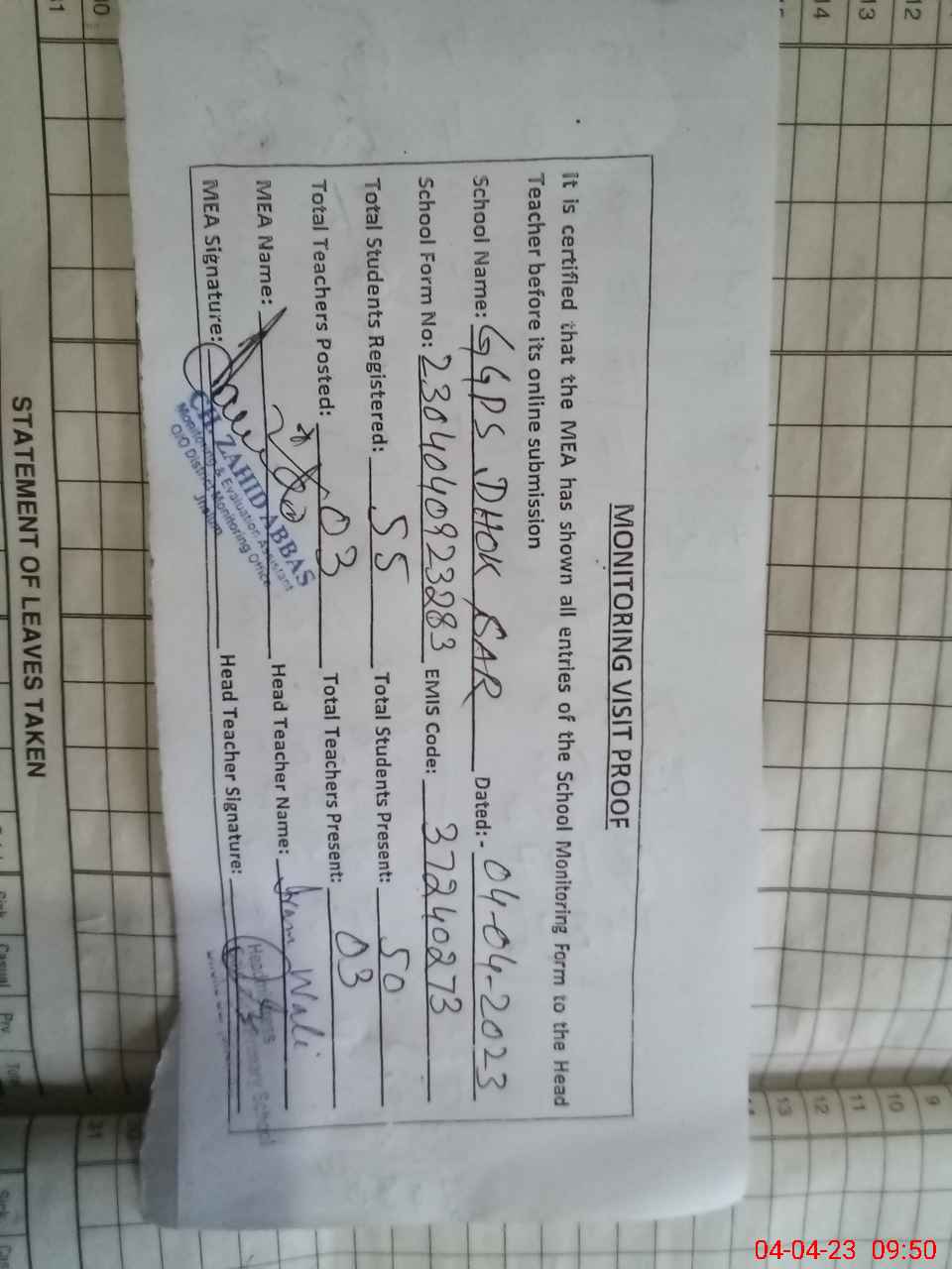 | Attendance Register | Head Teacher | MEA with School | Visit Proof |