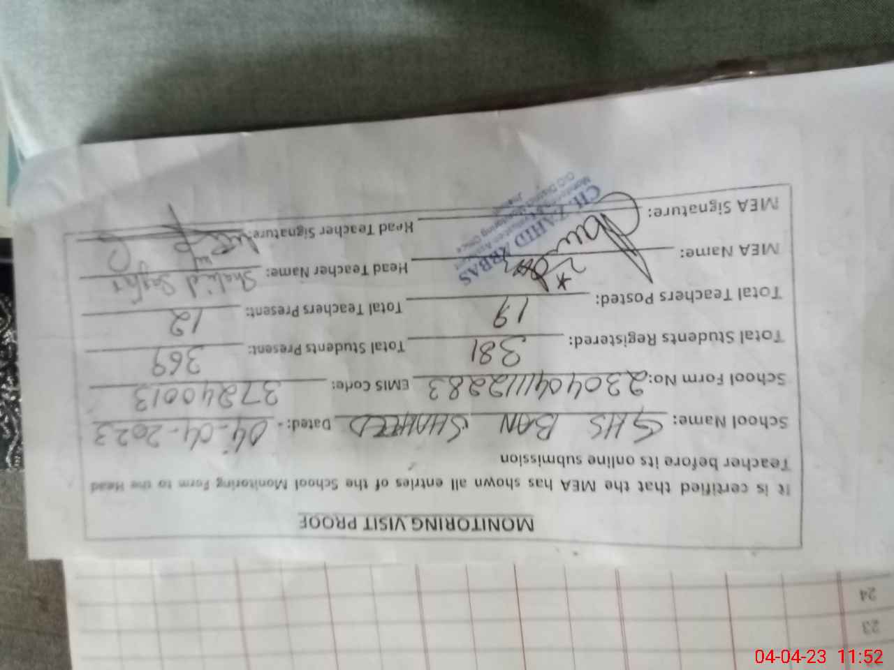 | Attendance Register | Head Teacher | MEA with School | Visit Proof |