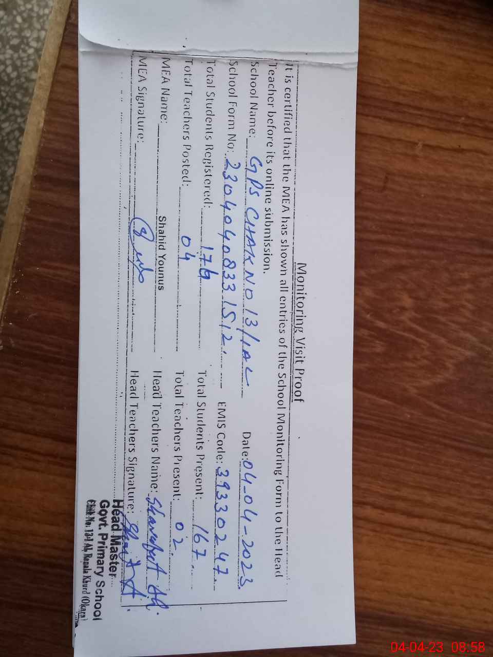 | Attendance Register | Head Teacher | MEA with School | Visit Proof |