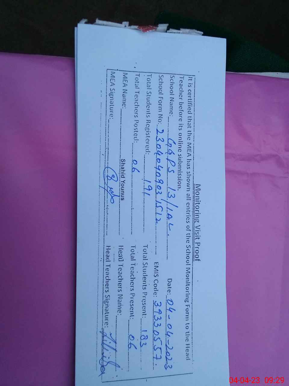 | Attendance Register | Head Teacher | MEA with School | Visit Proof |