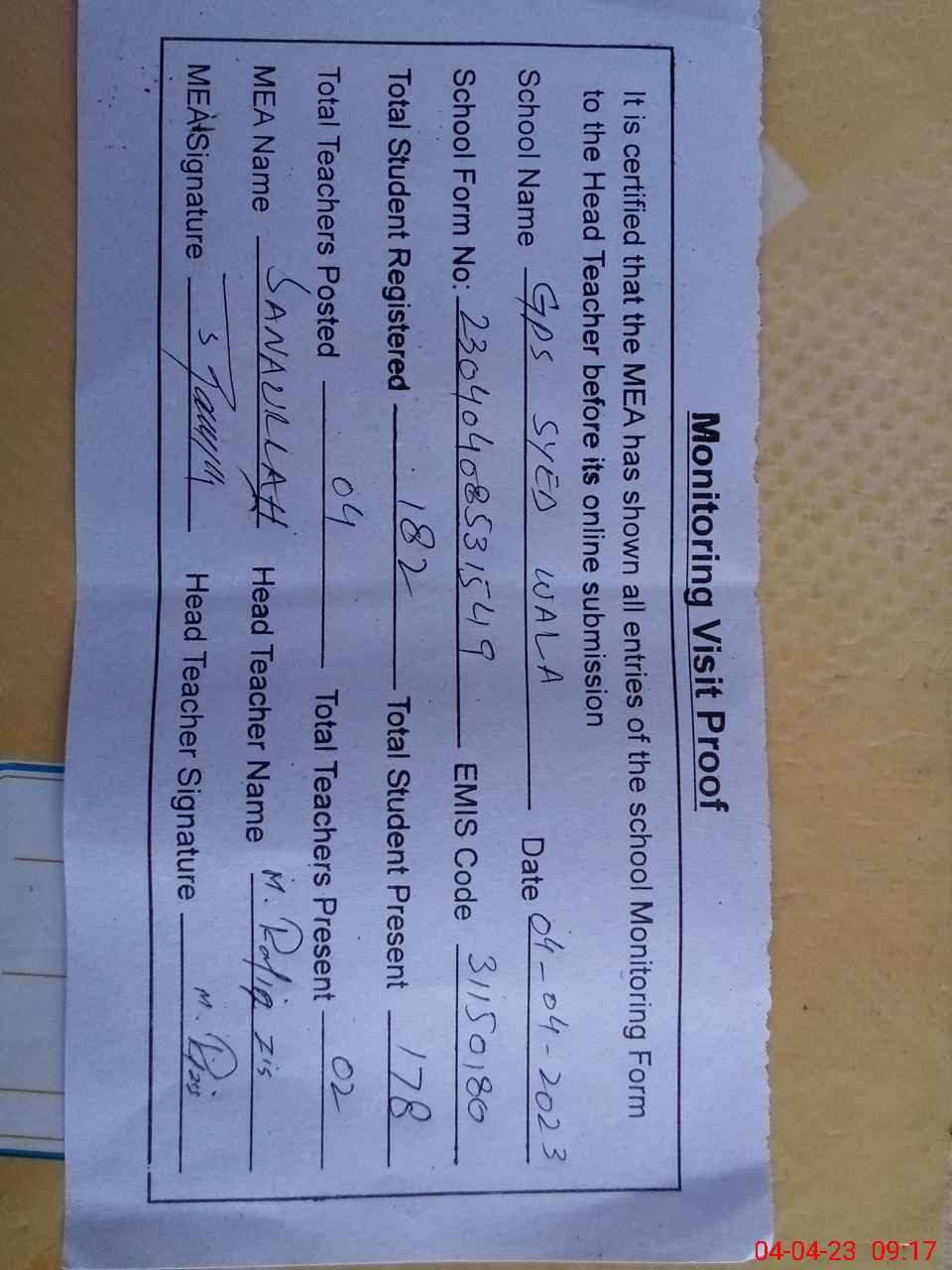 | EMIS Code: 31150180 | Name of School: GPS SAYED WALA | |||