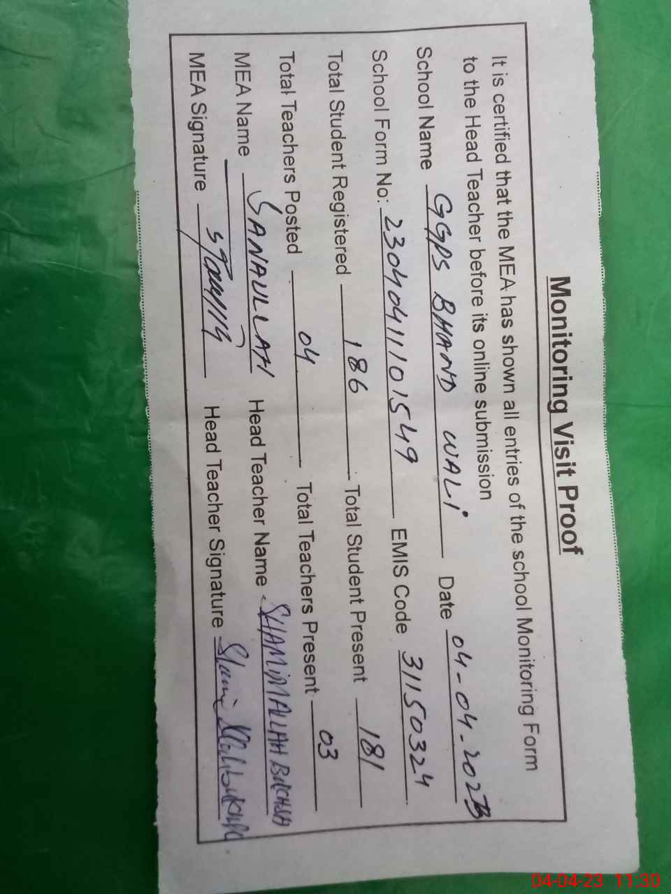 | Attendance Register | Head Teacher | MEA with School | Visit Proof |