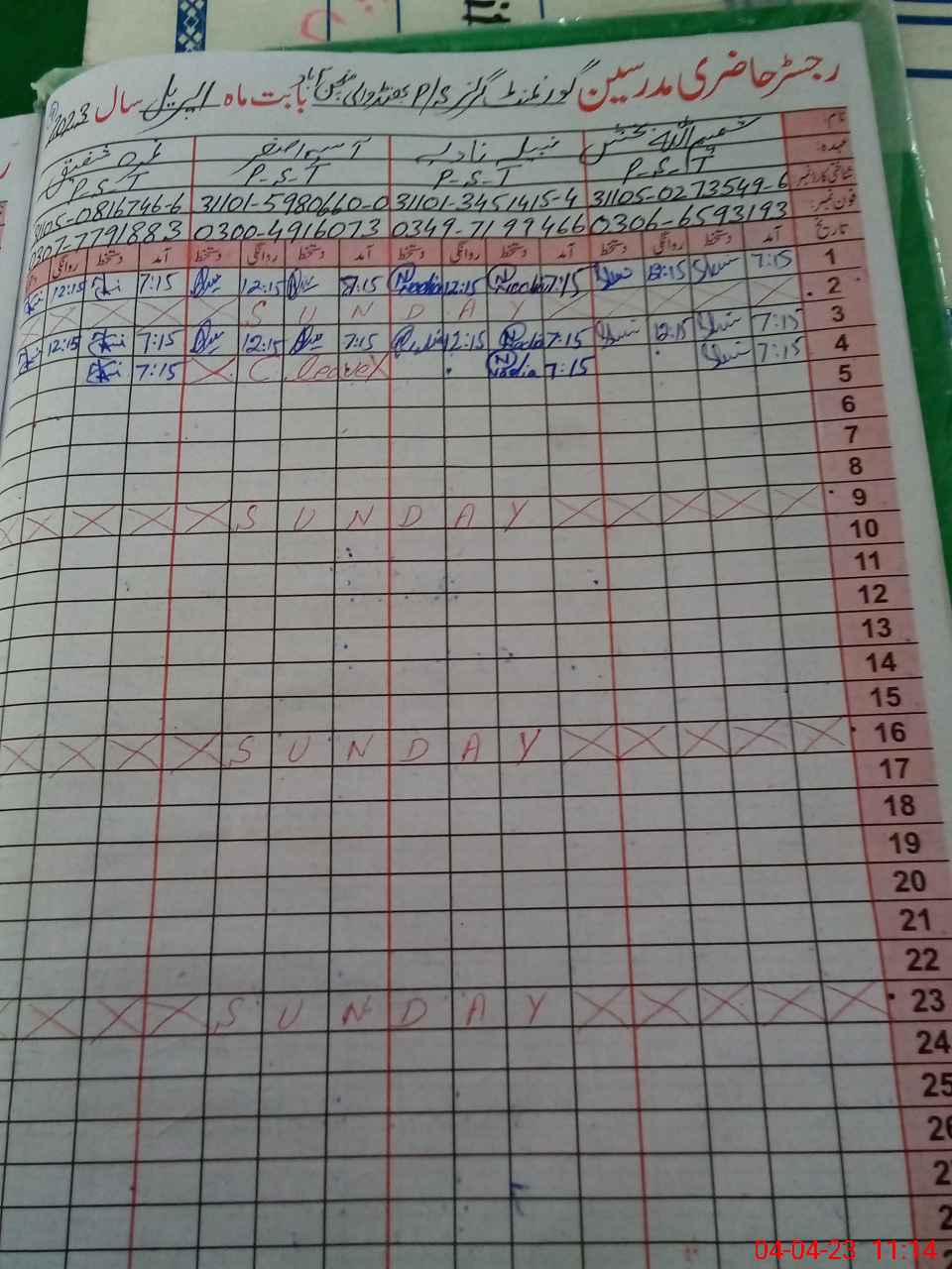 | CNIC | Full Name | Designation | R/C | Absence During Last Calender Month |