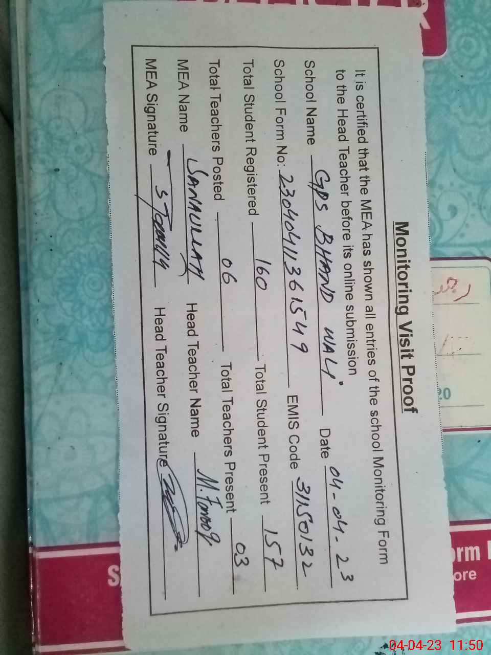 | Attendance Register | Head Teacher | MEA with School | Visit Proof |